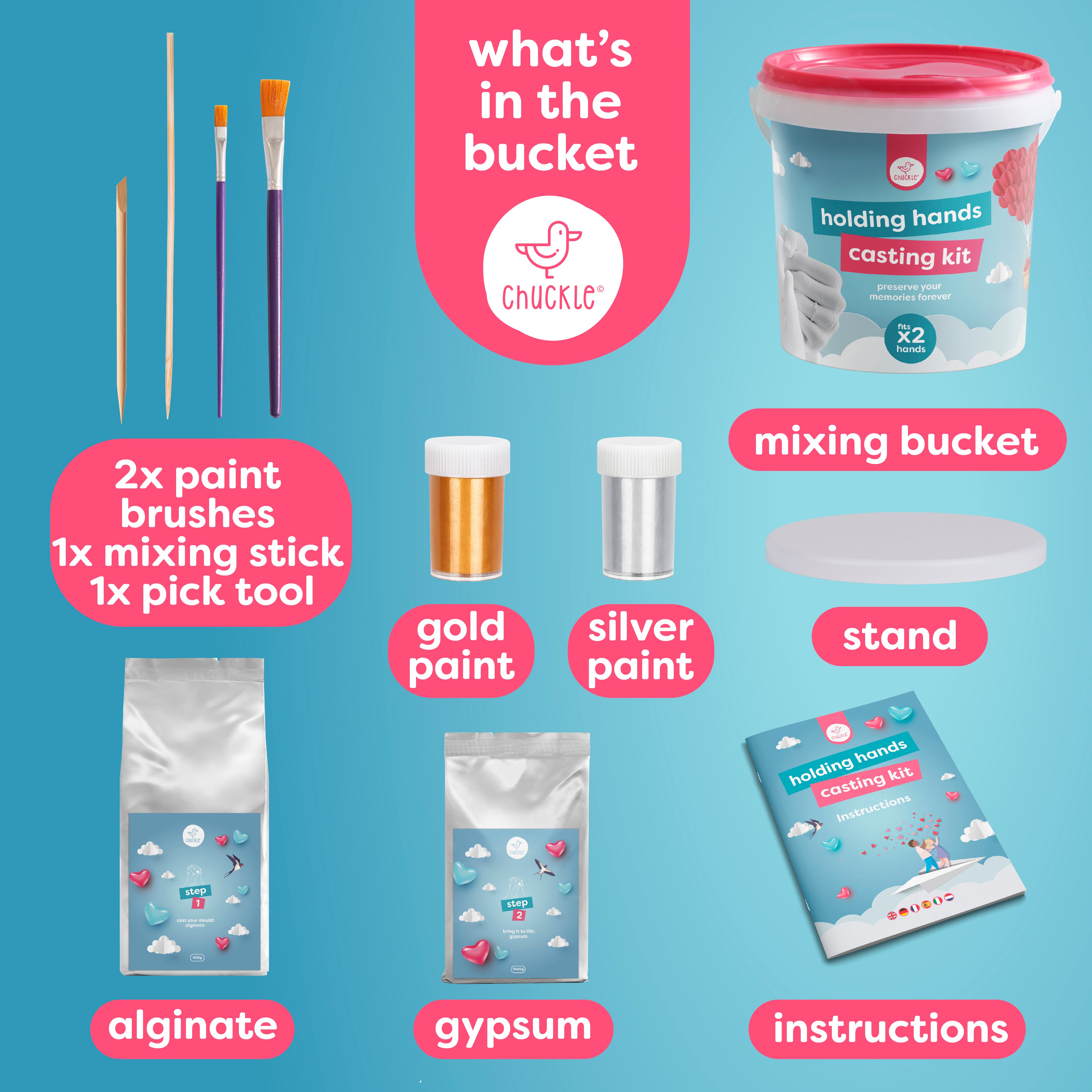 Complete and Easy-to-Use Kit for Treasured Memories: Our 3D Hand Casting Kit is an all-inclusive package designed to create a perfect and professional-looking hand sculpture. This kit contains everything needed for the process: 1 packet of plaster powder (1kg), 1 packet of alginate powder (650g), 1 gold paint (20ml), 1 silver paint (20ml), 1 paintbrush, 1 bamboo stick, 1 3.8L bucket, and 1 sculpture base. Along with these materials, the kit includes easy-to-follow instructions and a tutorial video to guide you seamlessly through the process. Whether you are a beginner or a seasoned DIY enthusiast, this kit ensures a stunning and everlasting keepsake without any hassle.