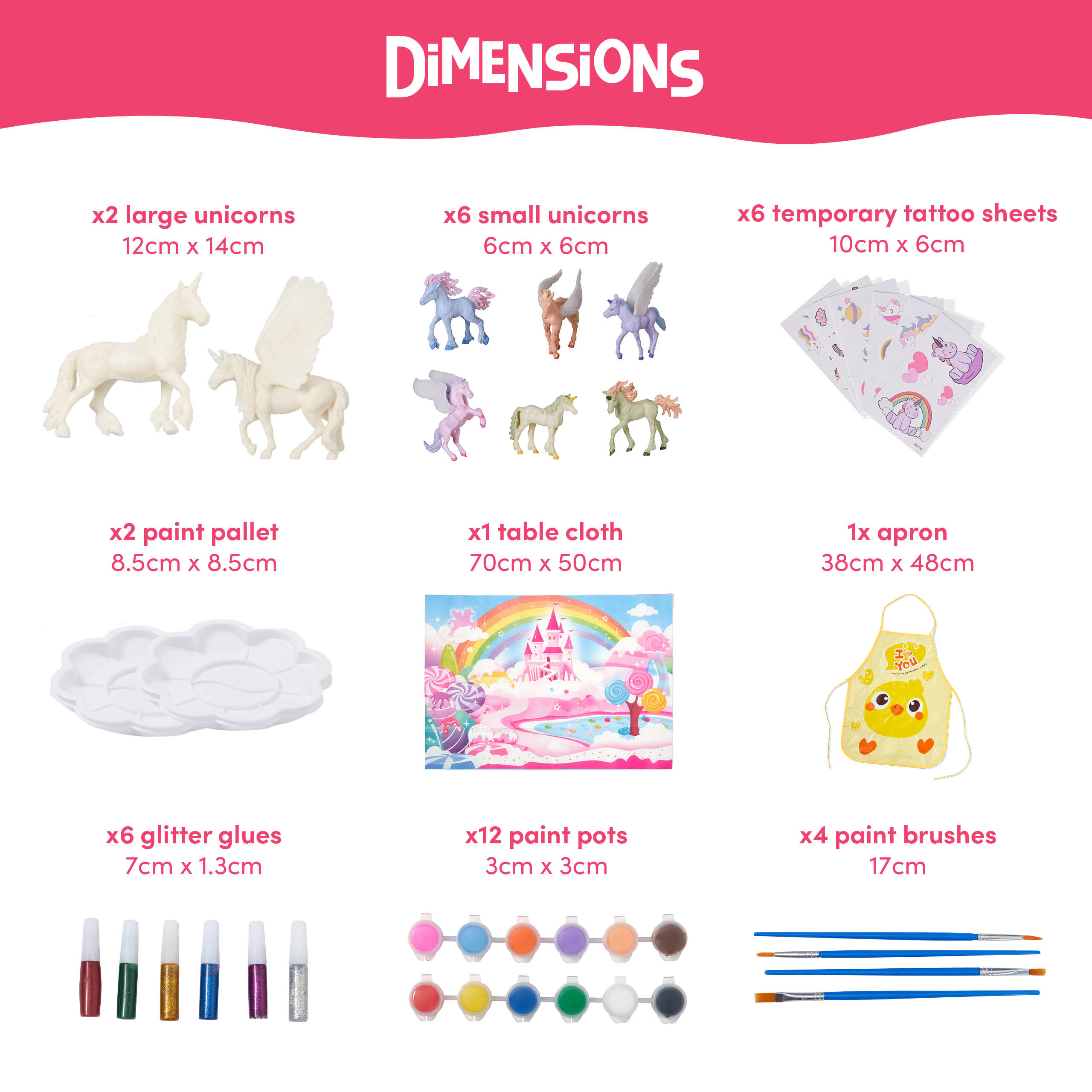Complete Artistic Adventure: Dive into a world of colour and magic with our Unicorn Paint Set, perfectly equipped to ignite the imagination of young artists. This comprehensive set comes with everything a child needs to start their artistic journey: 12 vibrant paints, 6 sparkling tubes of glitter glue, a high-quality paintbrush, and a protective apron. It's a one-stop solution for creative expression, offering a delightful range of materials to paint and decorate various unicorn figures.