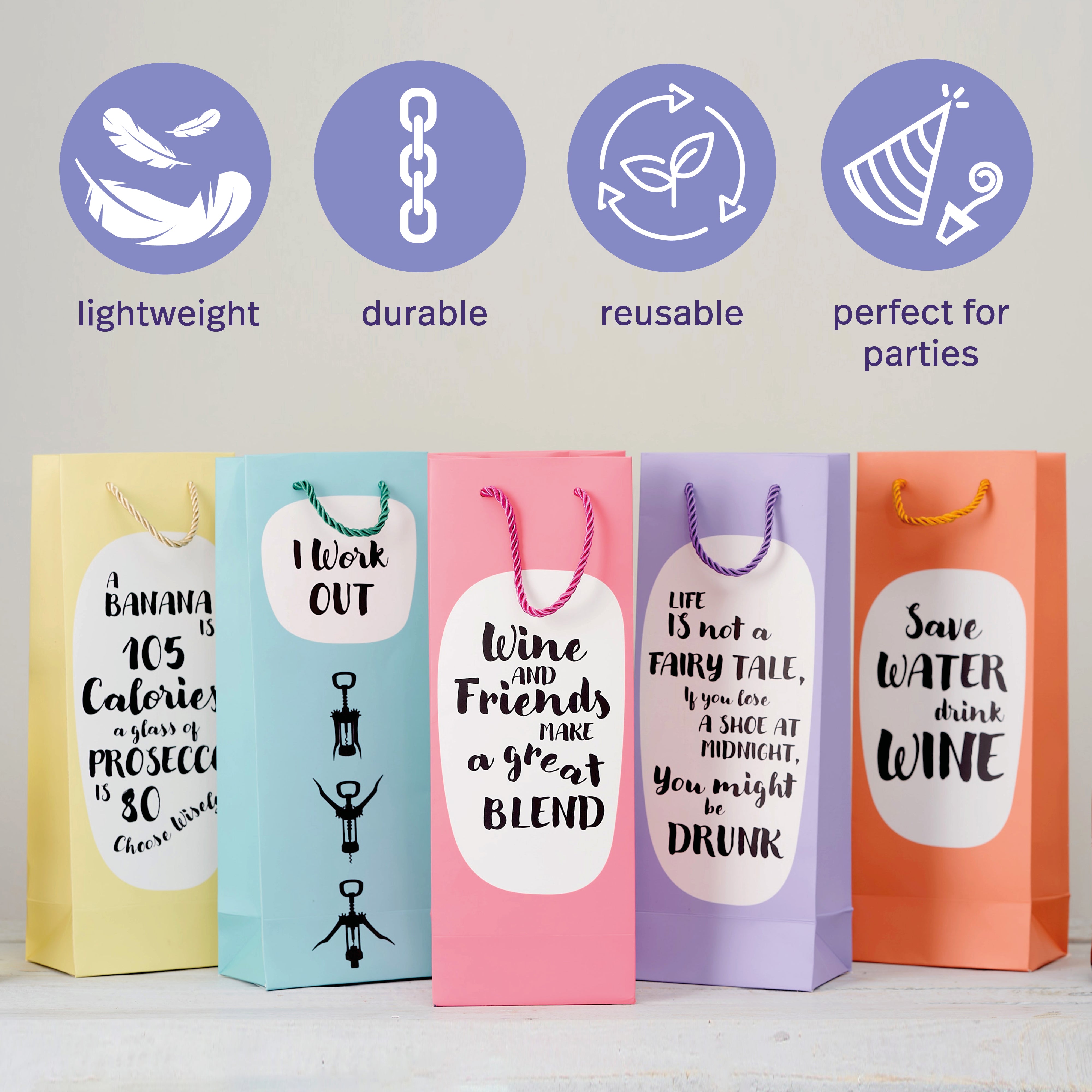 Witty and Stylish Presentation: Elevate your gift-giving experience with our collection of wine bottle gift bags, each adorned with five different humorous quotes that are sure to elicit smiles. These bags blend elegance with a touch of whimsy, making them perfect for adding a personalized and light-hearted touch to your wine gifts. The charming designs cater to various tastes and personalities, ensuring that each recipient feels special and appreciated.