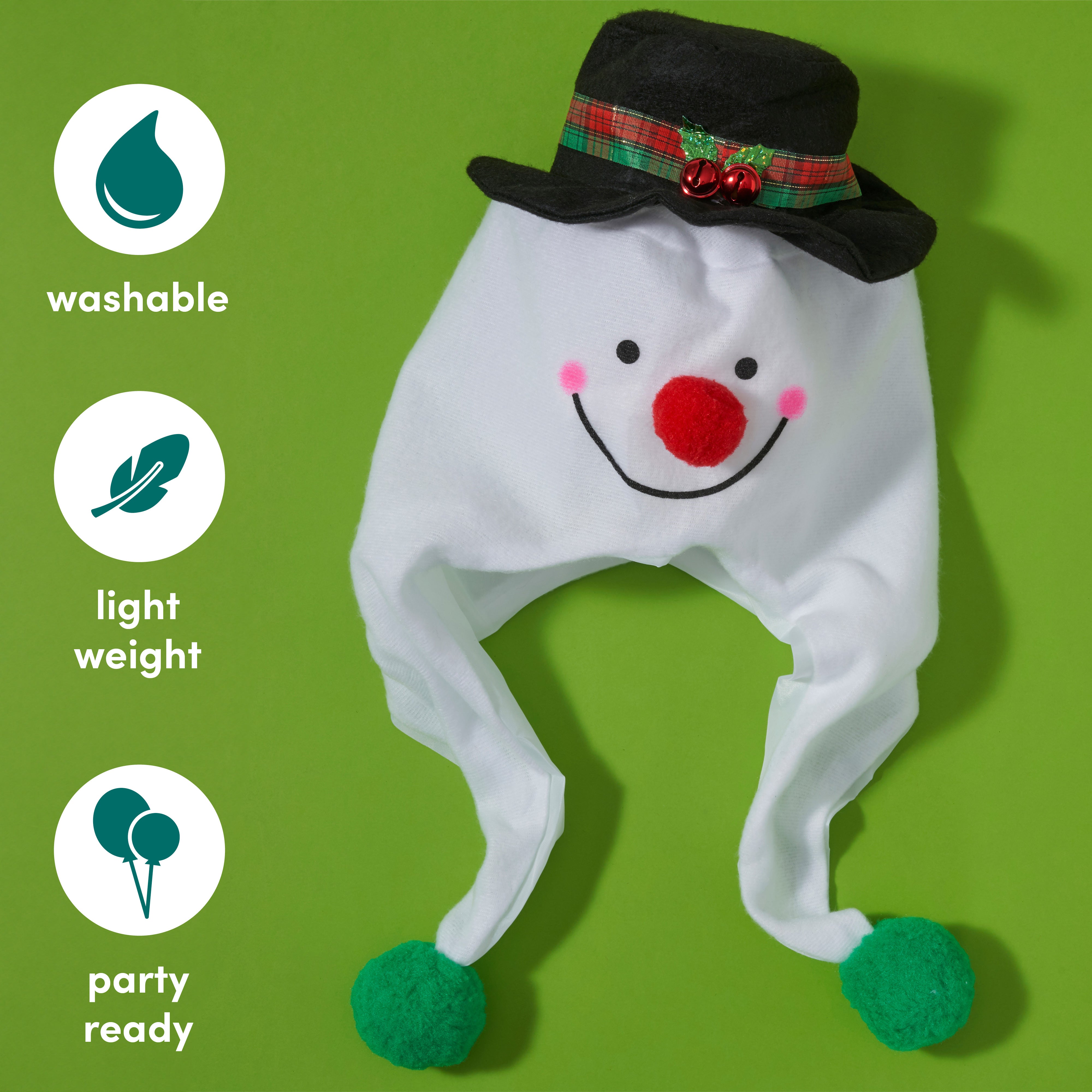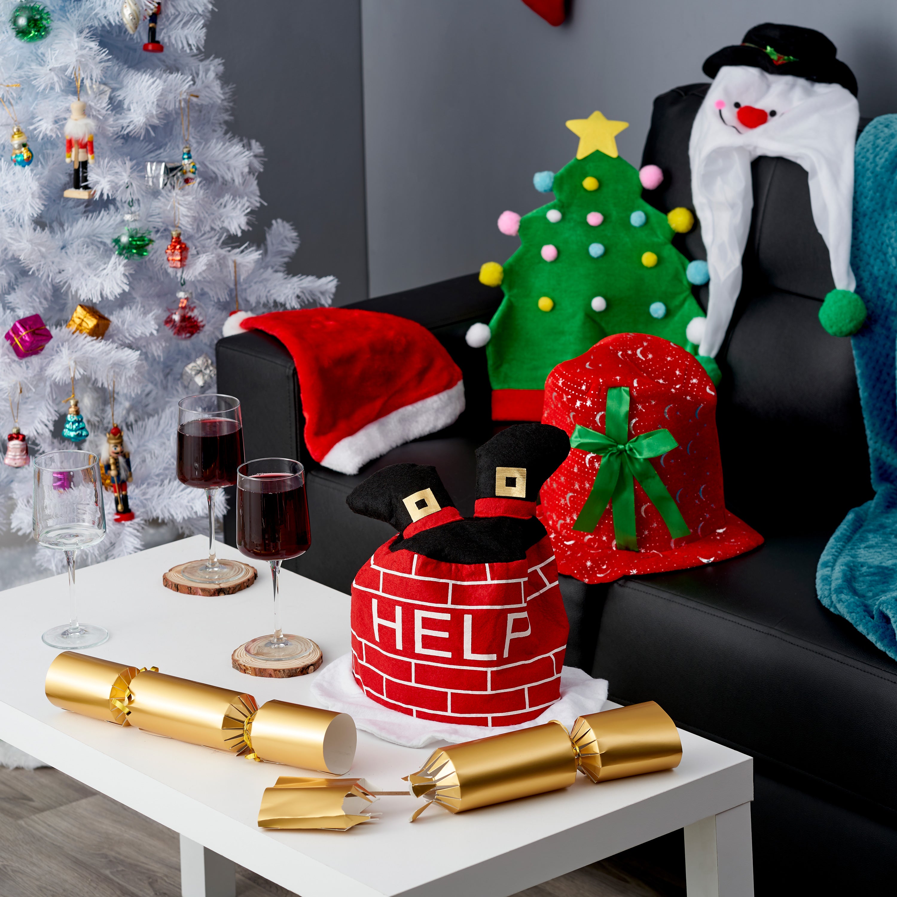 Assorted Hat Designs: Choose from 5 hilarious Christmas-themed hats, including Santa stuck down a chimney, a jolly snowman, a whimsical Christmas tree, a classic Santa hat, and a patterned top hat.