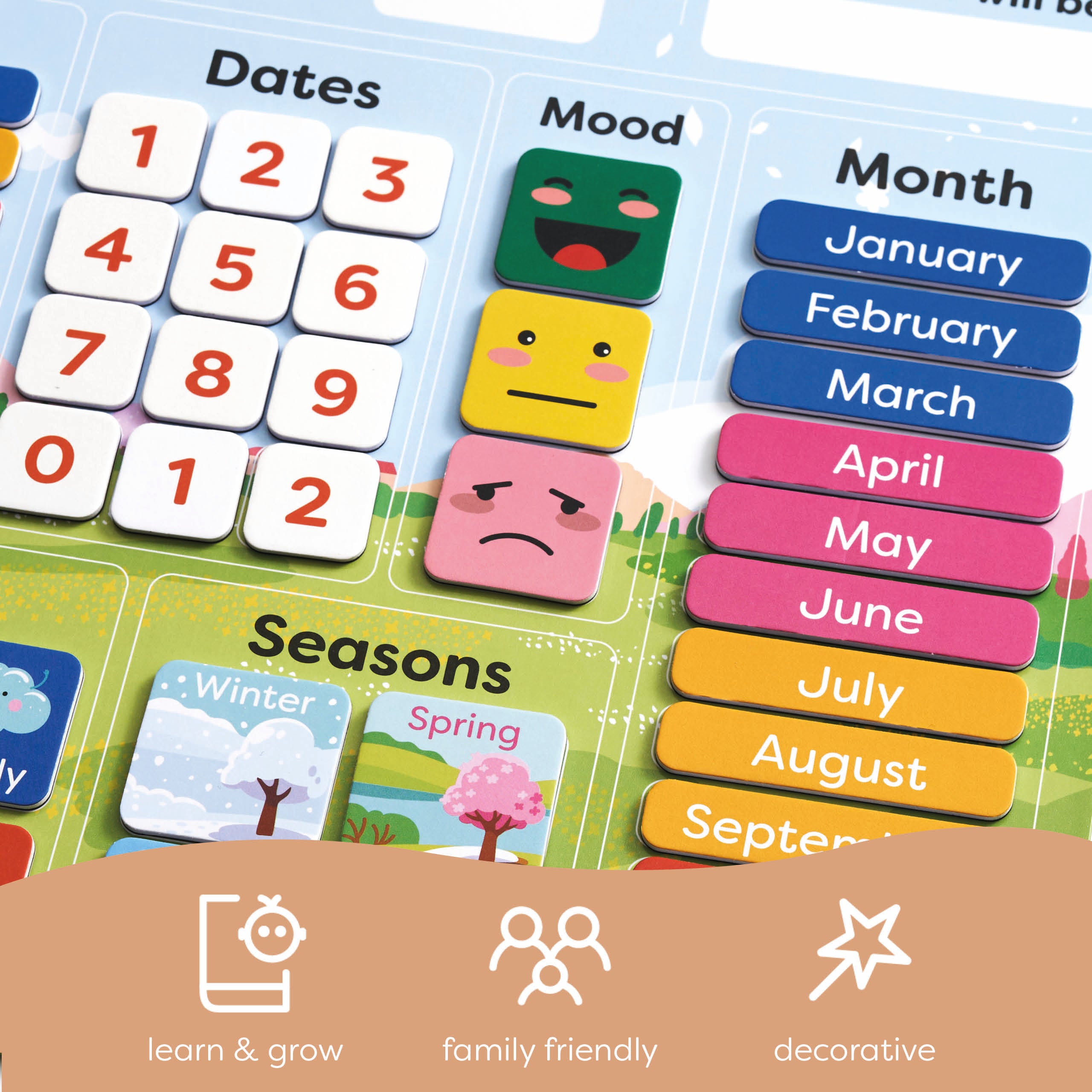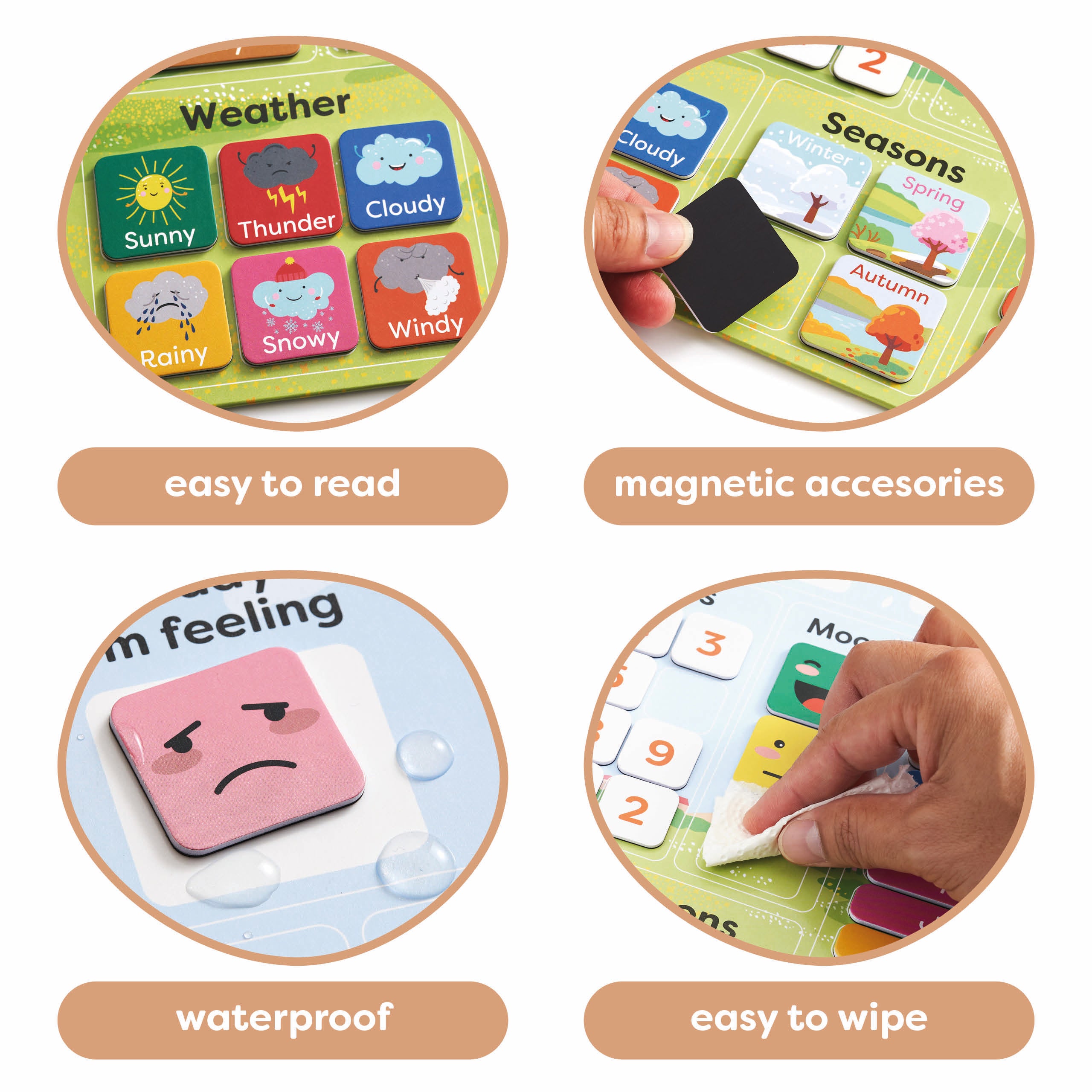 - Educational Fun - Foster cognitive growth at home or in the classroom with this 40 x 32cm magnetic calendar, igniting children's interest in time and weather concepts.
