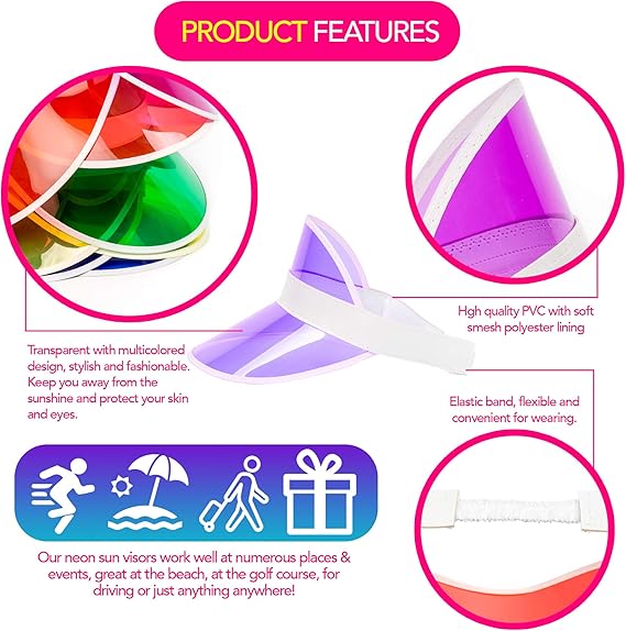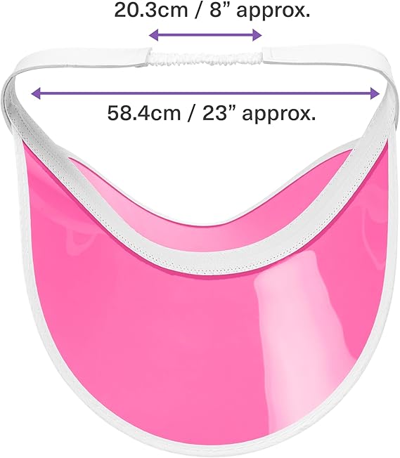 Elevate your group's style and stand out with our Neon Sun Visor Hats, the ultimate accessory for any fun-filled event. These visors are not just a nod to retro fashion; they're a vibrant addition to beach days, festivals, pool parties, and any themed gatherings like pub golf, 80s parties, hen, and stag dos. Their transparent design, coupled with six bright, neon colours, ensures you and your group shine, making these hats perfect for creating memorable moments.