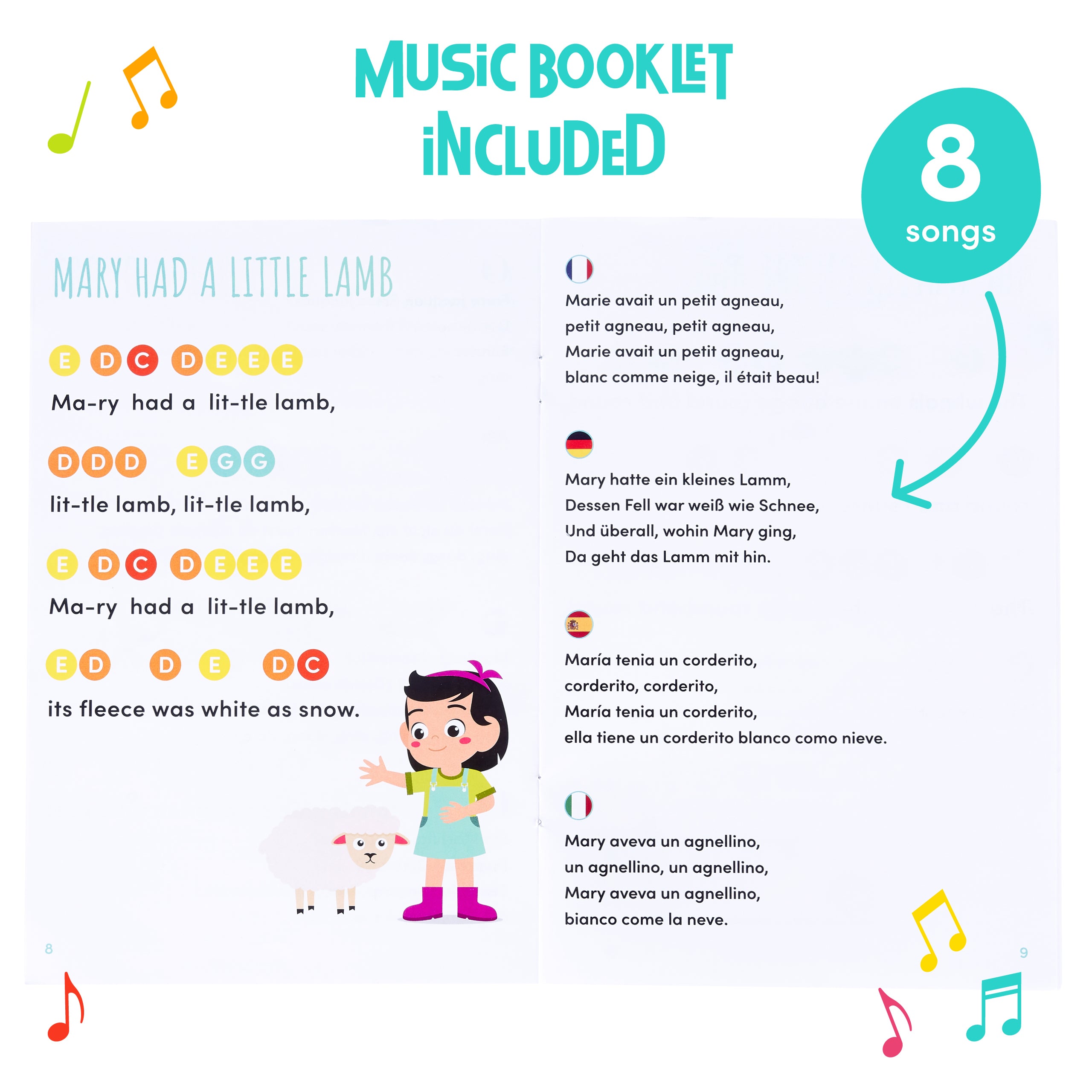 - Includes a multilingual music booklet for learning songs in 5 languages